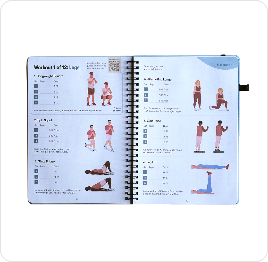 Each month, you get a physical, spiral-bound Habit Nest journal with 12 easy-to-follow bodyweight workouts you can do at home - no gym, no equipment, no guesswork.